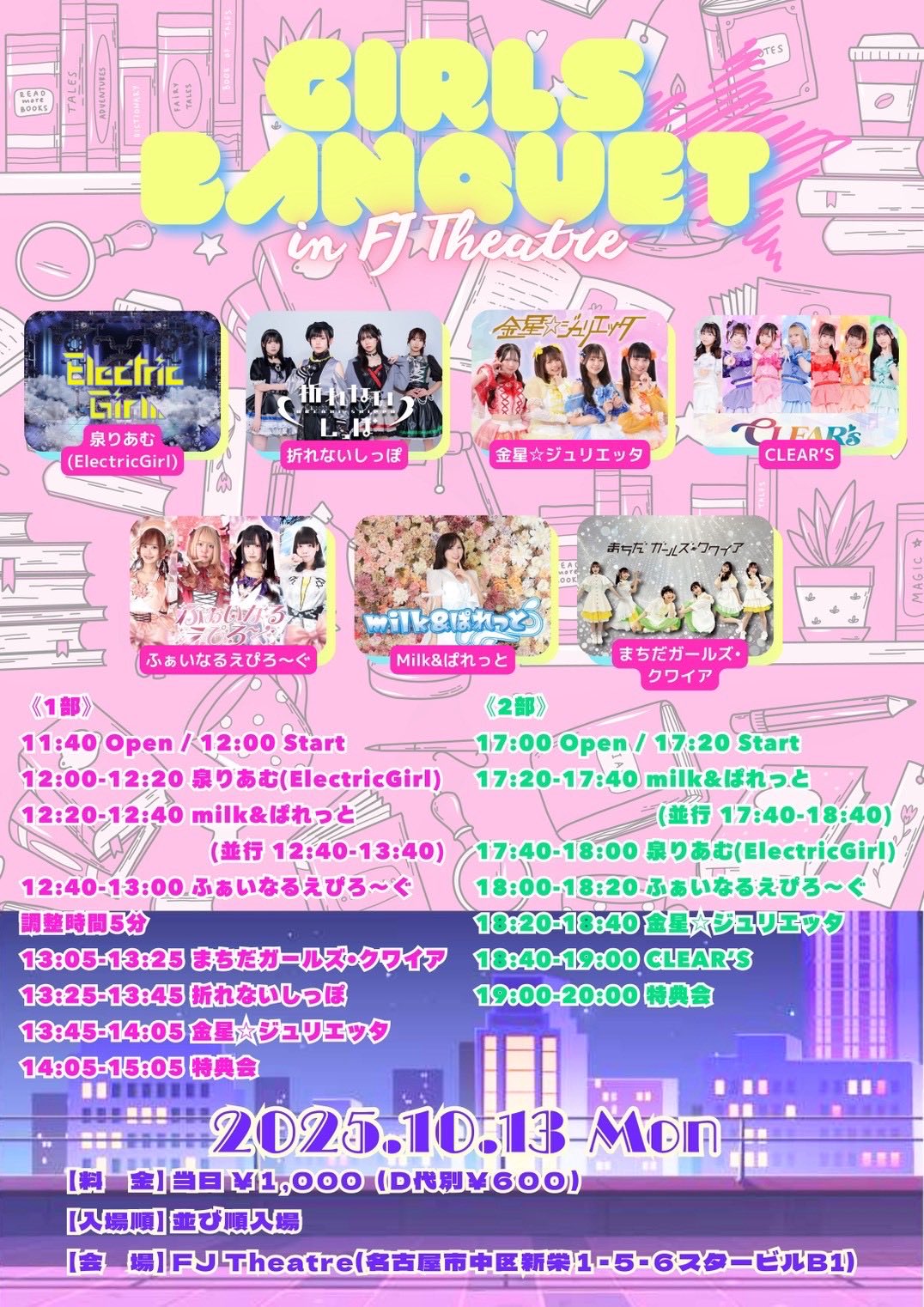 『GIRLS BANQUET in FJ Theatre』 1部 地図が利用できません 日時 Date(s) - 2025年10月13日12:00 - 15:00 カテゴリー MGCライブ 名古屋 2025年10月13日(月祝) 『GIRLS BANQUET in FJ Theatre』 1部 会場:名古屋 FJ theatre Open11:40/Start12:00 当日1,000円(D代別¥600) 【出演】 泉りあむ milk&パレット ふぁいなるえぴろ〜ぐ 折れないしっぽ 金星☆ジュリエッタ まちだガールズ・クワイア